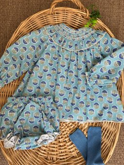 Camisa echa a mano con un cuadro en tono rosa maquillaje, cuello de volante con lazada azul. Un diseño exclusivo, cómodo y lleno de encanto para un look perfecto.
